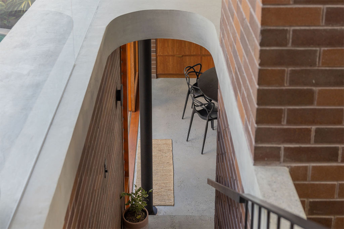 The light-filled living, kitchen, and dining area features a striking freestanding brick fireplace, while a sleek steel-framed stair ascends through floating concrete window hoods to new bedrooms and informal living spaces above. Careful detailing enhances the connection between indoors and outdoors.