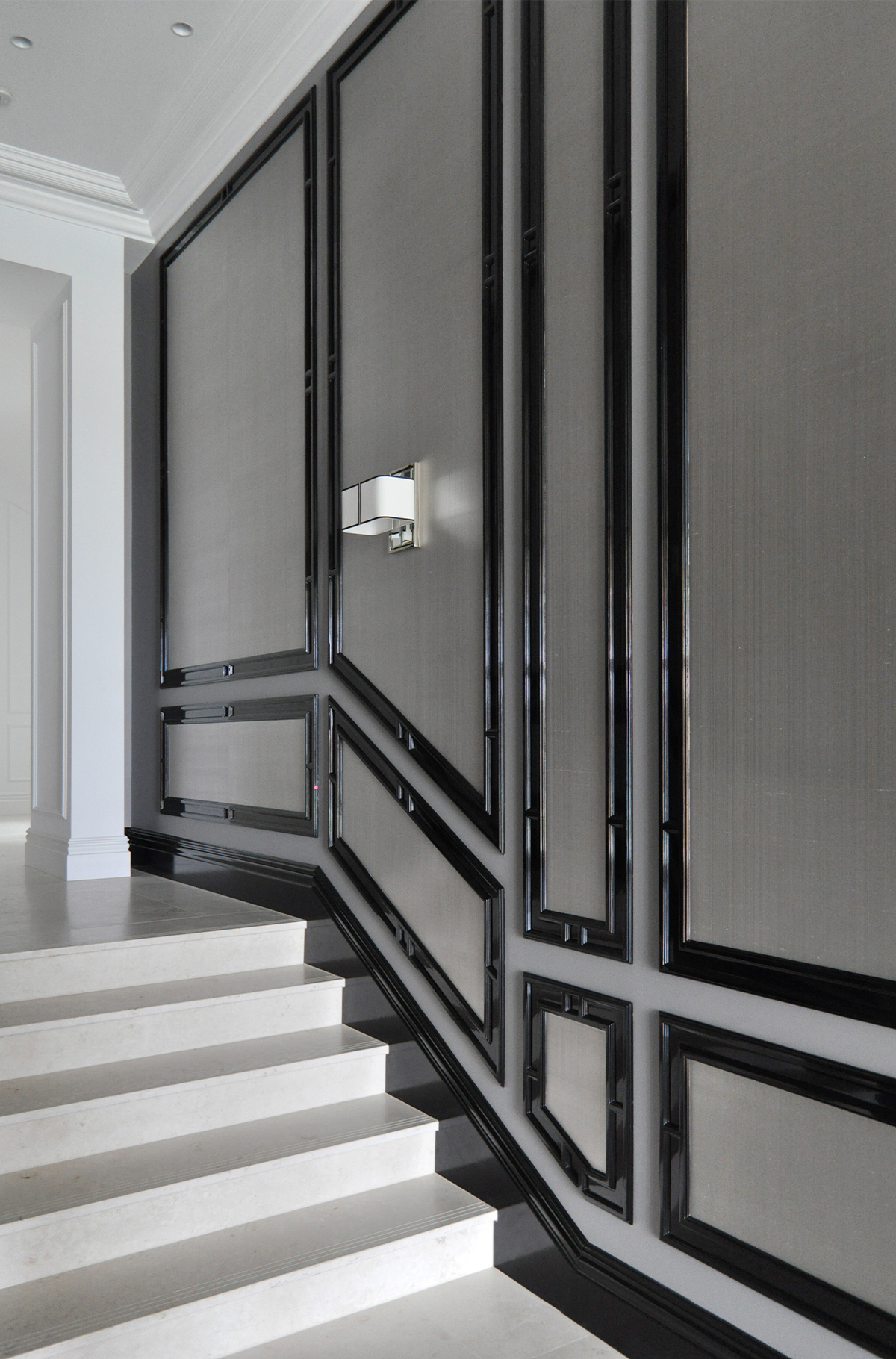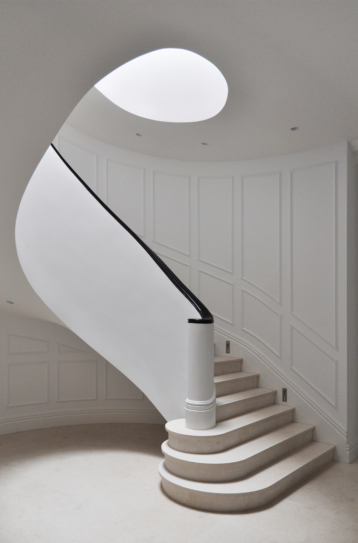 Situated on a sloping site, we created a series of platforms resulting in a stepped floor plan . A central spiral staircase connected each level of the site, featuring a bold black lacquer stair rail that follows a white French panelled wall detail up each floor. An abundance of natural light echoes through each floor through the steel framed decorative skylights.